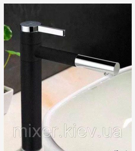 Высокий смеситель для умывальника чаши в черном с хромом цвете. Материал смесителя - латунь. Излив смесителя поворотный.